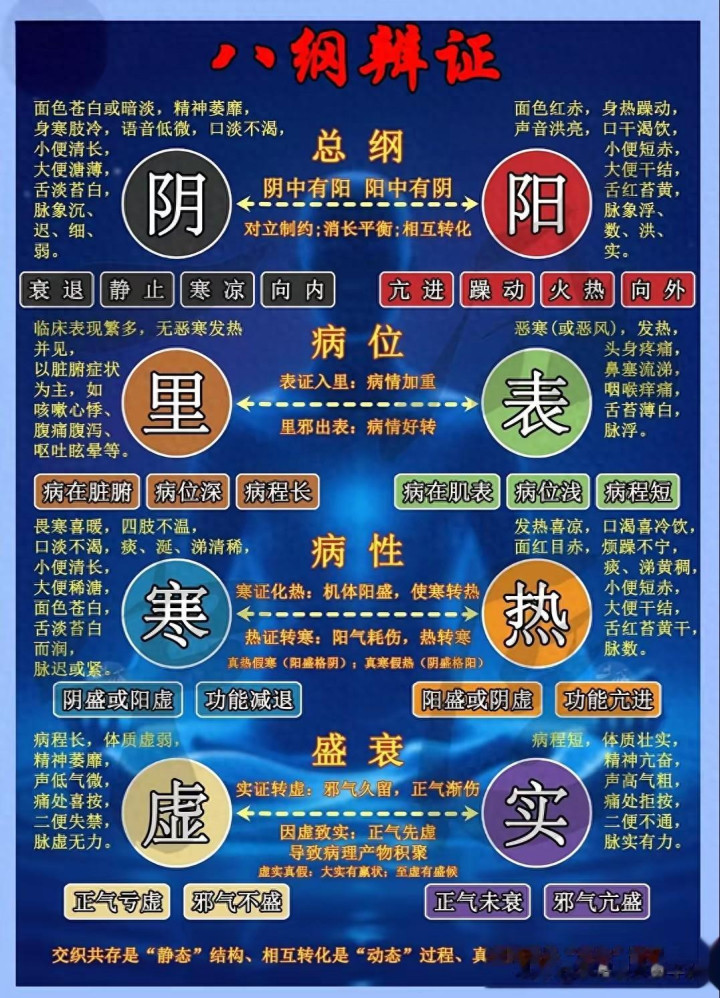 而这所有变化的深层律动,终归于“阴阳”的哲学舞蹈。阴阳互根,彼此为存在的依据,如没有寒就无所谓热;阴阳对立,相互制约,维持着动态的平衡;阴阳消长,此进彼退,如昼夜交替;而在特定条件下,阴阳又可相互转化,寒极可生热,热极可生寒,重阴必阳,重阳必阴。八纲辨证的整个过程,便是在这动态的阴阳平衡体系中,精准定位那失衡的枢机。