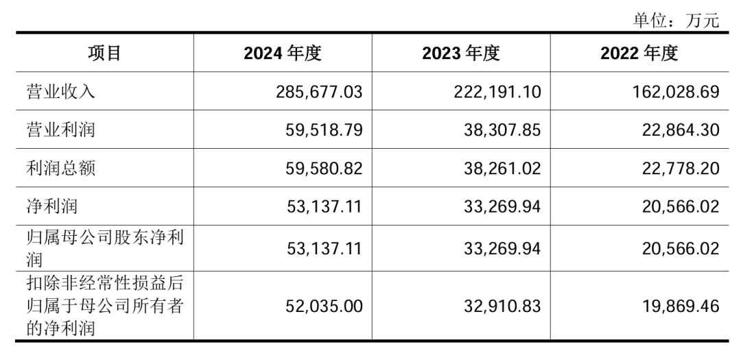 从悍高集团披露的业绩来看,该公司过去三年业绩持续增长。悍高集团2022年、2023年、2024年营业收入分别为162,028.69万元、222,191.10万元和285,677.03万元,年均复合增长率为32.78%;扣除非经常性损益后归属于母公司所有者的净利润分别为19,869.46万元、32,910.83万元和52,035.00万元,年均复合增长率为61.83%。